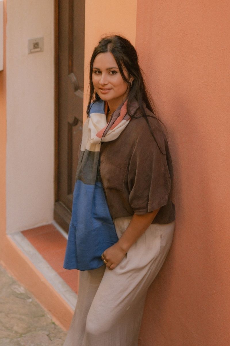 Son coloris bleu profond dynamise une silhouette en un clin d'œil, en apportant une note à la fois apaisante et lumineuse. Porté autour du cou, sur les épaules ou noué façon foulard, il s’adapte à vos envies et à chaque moment de la journée.