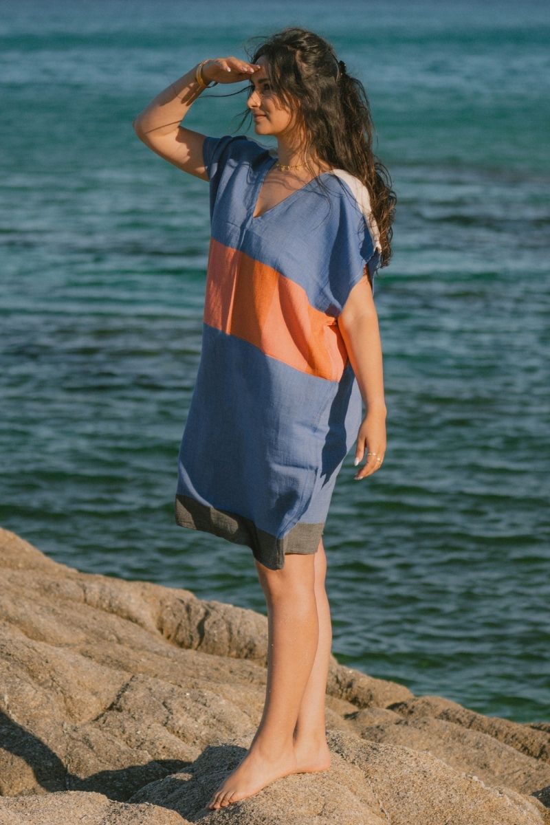Sa matière 100% coton biologique lui apporte une grande respirabilité, et sa coupe vous permet de supporter les moments chauds de la journée. Selon la silhouette que vous désirez cette robe estivale peut se porter ample ou ceinturée, de face le décolleté en V est profond comme il faut et de dos il est joliment maintenu par un ruban métallisé.